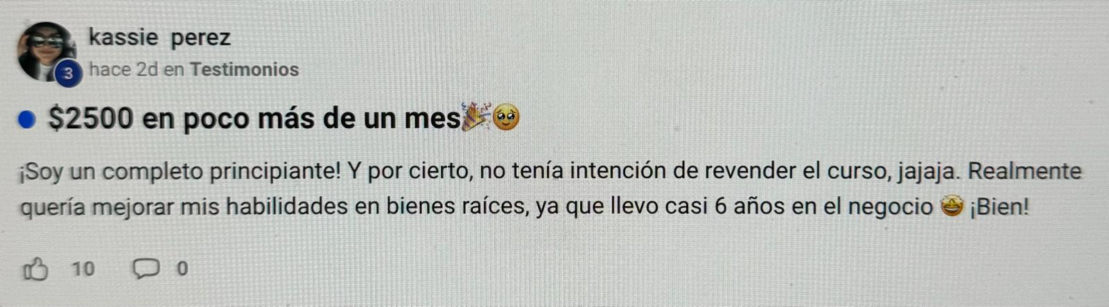 Además, una vez compras el curso también adquieres los derechos de reventa (MRR en inglés). En otras palabras, el curso se vuelve tuyo y lo puedes vender las veces que quieras y quedarte con el 100% del dinero.